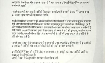 आदरणीय केजरीवाल जी इस पत्र के माध्यम से में आज आम आदमी पार्टी की प्राथमिक सदस्यता से इस्तीफा दे रहा हूँ। आपके...
