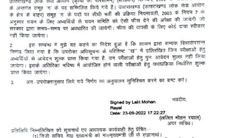 उत्तराखण्ड लोक सेवा आयोग की परिधि के अन्तर्गत समूह ‘ग’ के पदों पर भर्ती हेतु अभ्यर्थियों से आवेदन शुल्क लिये जाने के...
