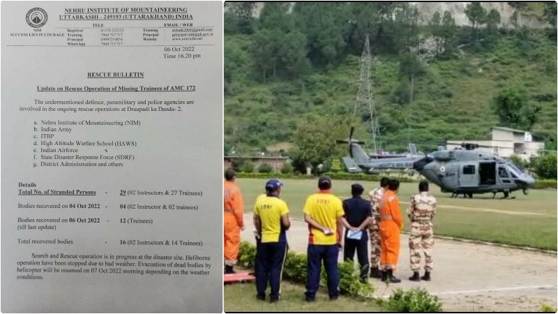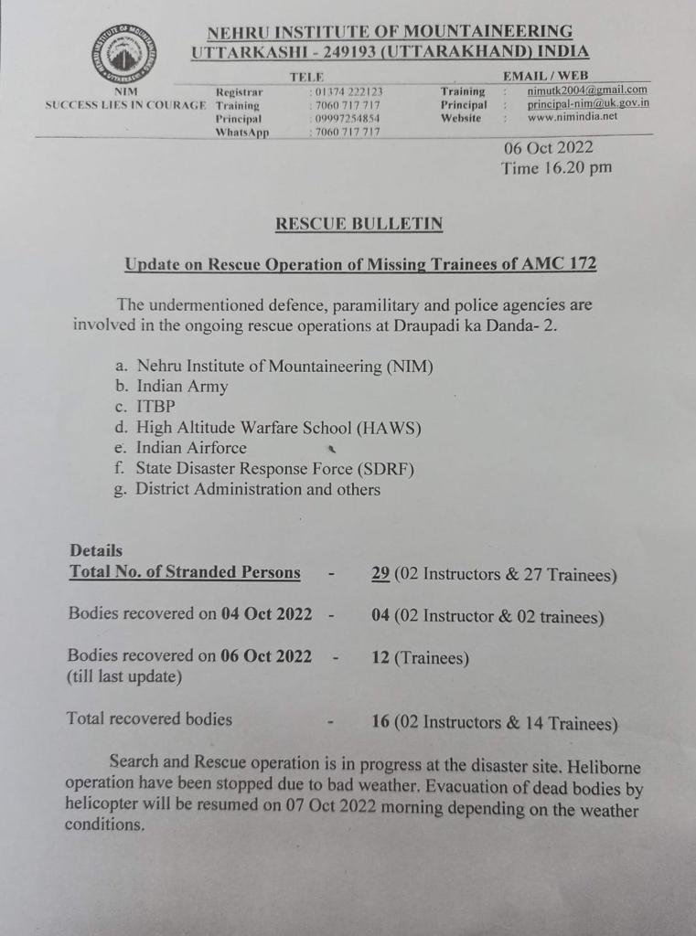 द्रौपदी का डांडा (डीकेडी) चोटी पर हुए हिमस्खलन (एवलांच) की चपेट में आकर क्रेवास में दबे नेहरू पर्वतारोहण संस्थान (निम) के प्रशिक्षु पर्वतारोहियों की खोज के लिए आज गुरुवार को भी खोज अभियान चलाया जा रहा है। निम और एसडीआरएफ की रेस्क्यू टीम ने गुरुवार को 12 और शव न‍िकाले। अबतक कुल संख्‍या 16 पहुंच गई है जबक‍ि 13 अभी भी लापता हैं। वहीं मौसम ब‍िगड़ जाने से रेस्‍क्‍यू रोका गया।
