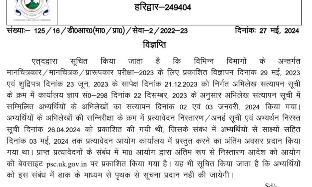 प्राप्त प्रत्यावेदनों के संबंध में मा० आयोग द्वारा अंतिम रूप से निस्तारण आदेश को आयोग की बेवसाइट psc.uk.gov.in पर प्रकाशित किया गया है। यह भी सूचित किया जाता है कि अभ्यर्थियों को इस संबंध में डाक के माध्यम से पृथक से सूचना प्रदान नही की जायेगी।