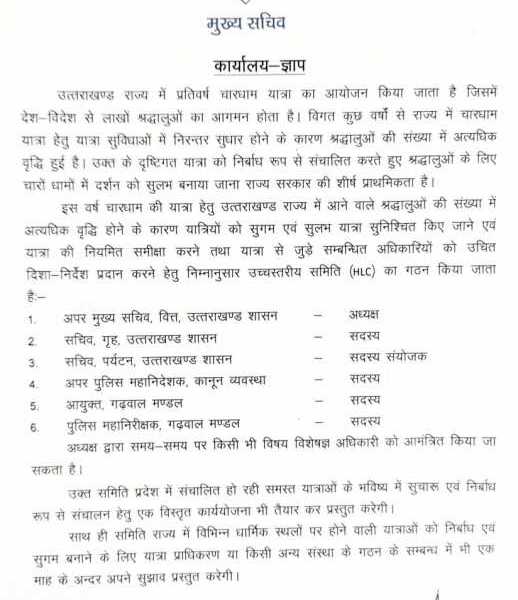 इस वर्ष चारधाम की यात्रा हेतु उत्तराखण्ड राज्य में आने वाले श्रद्धालुओं की संख्या में अत्यधिक वृद्धि होने के कारण यात्रियों को सुगम एवं सुलभ यात्रा सुनिश्चित किए जाने एवं यात्रा की नियमित समीक्षा करने तथा यात्रा से जुड़े सम्बन्धित अधिकारियों को उचित दिशा-निर्देश प्रदान करने हेतु निम्नानुसार उच्चस्तरीय समिति (HLC) का गठन किया जाता है:-