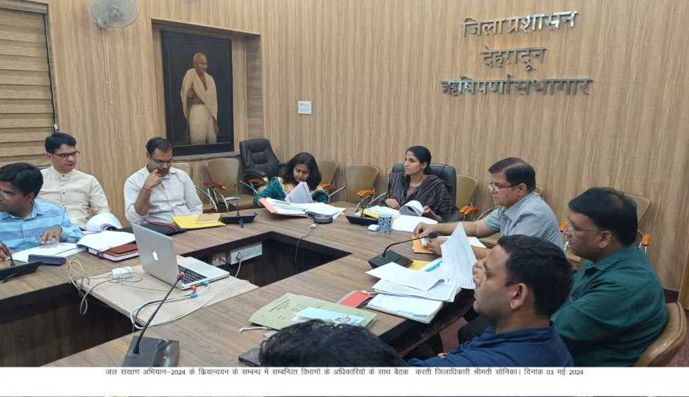 देहरादून :- जिलाधिकारी श्रीमती सोनिका की अध्यक्षता में ऋषिपर्णा सभागार कलेक्टेट में जल संरक्षण अभियान-2024 के क्रियान्वयन के सम्बन्ध में सम्बन्धिता विभागों के अधिकारियों के साथ बैठक आयोजित की गई।