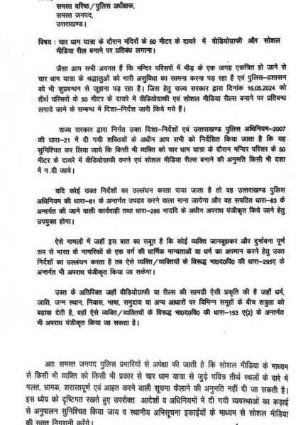राज्य सरकार द्वारा निर्गत उक्त दिशा-निर्देशों एवं उत्तराखण्ड पुलिस अधिनियम-2007 की धारा-21 में दी गयी शक्तियों के अधीन आप सभी को निर्देशित किया जाता है कि यह सुनिश्चित कर लिया जाये कि किसी भी व्यक्ति को चार धाम यात्रा के दौरान मन्दिर परिसर के 50 मीटर के दायरे में वीडियोग्राफी करने एवं सोशल मीडिया रील्स बनाने की अनुमति किसी भी दशा में न.दी जाये।