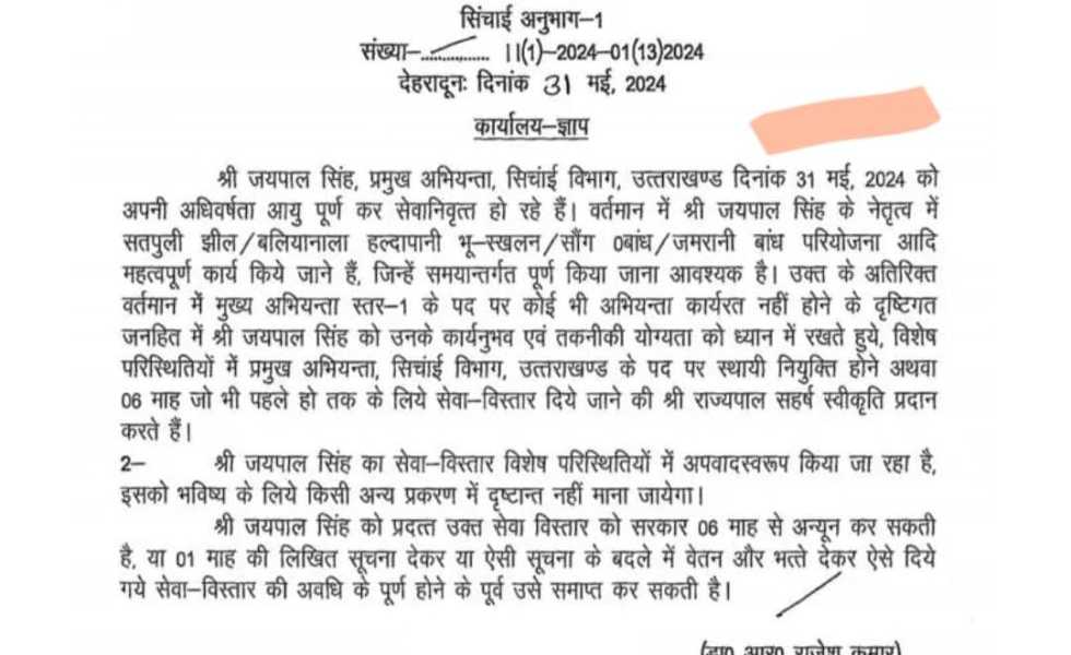 उक्त के अतिरिक्त वर्तमान में मुख्य अभियन्ता स्तर-1 के पद पर कोई भी अभियन्ता कार्यरत नहीं होने के दृष्टिगत जनहित में जयपाल सिंह को उनके कार्यनुभव एवं तकनीकी योग्यता को ध्यान में रखते हुये, विशेष परिस्थितियों में प्रमुख अभियन्ता, सिचाई विभाग, उत्तराखण्ड के पद पर स्थायी नियुक्ति होने अथवा 06 माह जो भी पहले हो तक के लिये सेवा विस्तार दिये जाने की राज्यपाल सहर्ष स्वीकृति प्रदान करते हैं।
