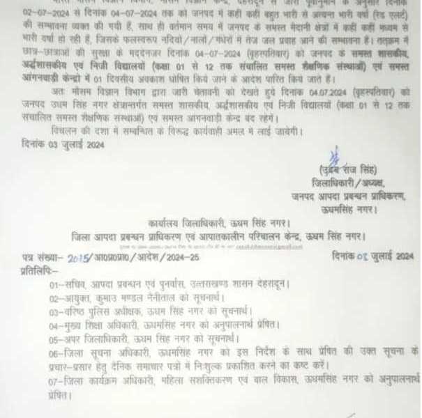 अतः मौसम विज्ञान विभाग द्वारा जारी चेतावनी को देखते हुये दिनांक 04.07.2024 (बृहस्पतिवार) को जनपद उधम सिंह नगर क्षेत्रान्तर्गत समस्त शासकीय, अर्द्धशासकीय एवं निजी विद्यालयों (कक्षा 01 से 12 तक संचालित समस्त शैक्षणिक संस्थाओं) एवं समस्त आंगनवाड़ी केन्द्र बंद रहेगें।