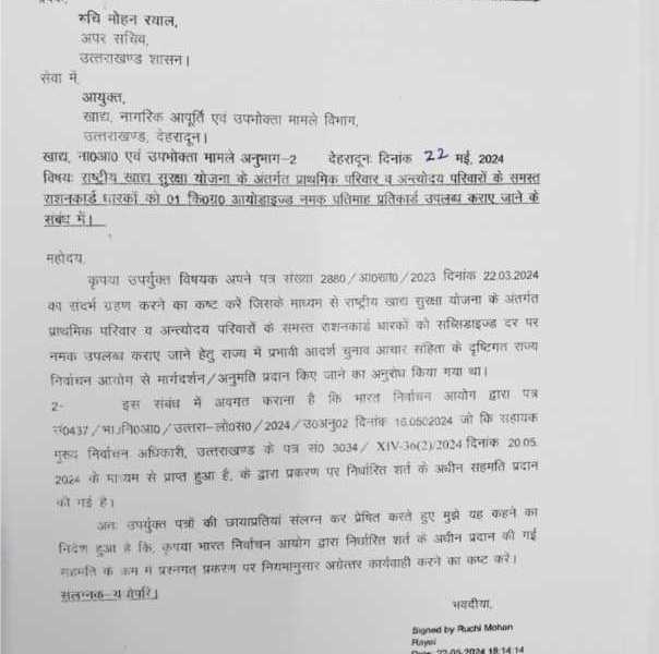 प्रदेश सरकार में खाद्य,नागरिक आपूर्ति एवं उपभोक्ता मामलों की मंत्री रेखा आर्या ने जानकारी देते हुए बताया कि खाद्य विभाग गरीब राशनकार्ड धारकों के लिए संजीवनी का काम करता है। उनकी जो मूलभूत आवश्यकताएं जिनमे गेहूं,चावल, शामिल हैं उन्हें उपलब्ध भी कराया जा रहा है। इसी क्रम में अब विभाग फोर्टिफाइड चावल की ही तरह आयोडीन युक्त नमक देने जा रहा है।यह नमक अंत्योदय और प्राथमिक परिवारों को बेहद ही रियायती दरों पर प्रतिमाह 1 किलो दिया जाएगा।
