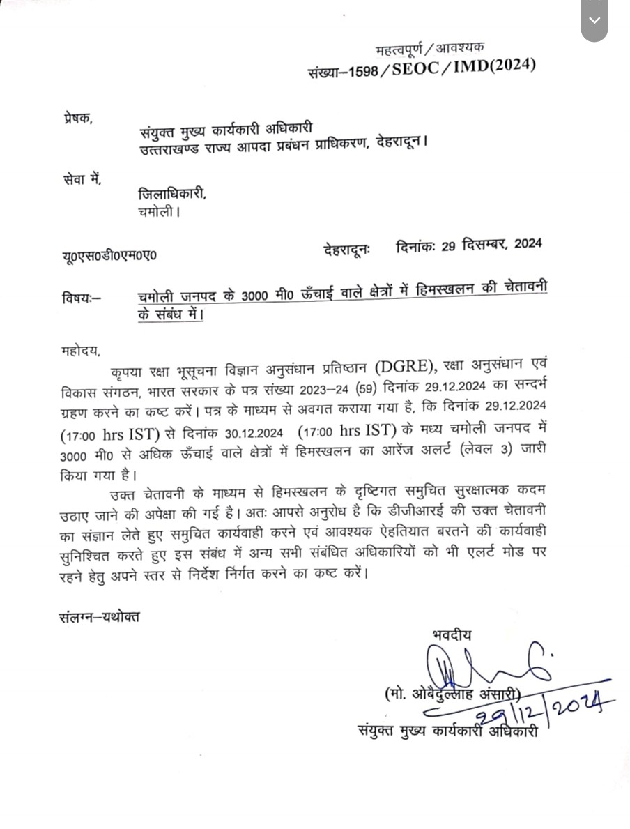 कृपया रक्षा भूसूचना विज्ञान अनुसंधान प्रतिष्ठान (DGRE), रक्षा अनुसंधान एवं विकास संगठन, भारत सरकार के पत्र संख्या 2023-24 (59) दिनांक 29.12.2024 का सन्दर्भ ग्रहण करने का कष्ट करें। पत्र के माध्यम से अवगत कराया गया है, कि दिनांक 29.12.2024 (17:00 hrs IST) से दिनांक 30.12.2024 (17:00 hrs IST) के मध्य चमोली जनपद में 3000 मी० से अधिक ऊँचाई वाले क्षेत्रों में हिमस्खलन का आरेंज अलर्ट (लेवल 3) जारी किया गया है।