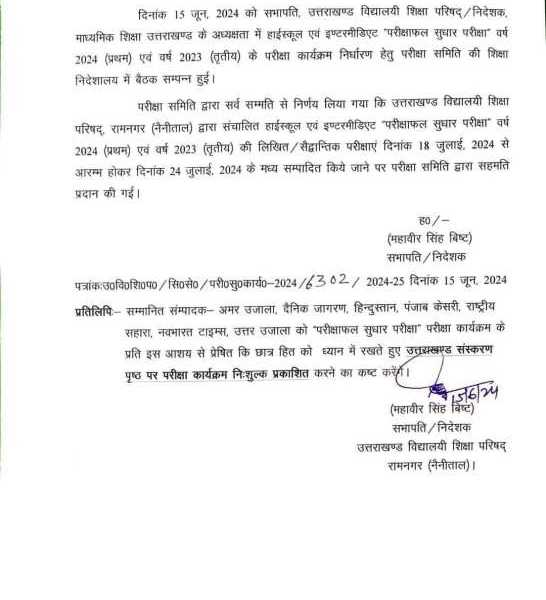परीक्षा समिति द्वारा सर्व सम्मति से निर्णय लिया गया कि उत्तराखण्ड विद्यालयी शिक्षा परिषद्, रामनगर (नैनीताल) द्वारा संचालित हाईस्कूल एवं इण्टरमीडिएट “परीक्षाफल सुधार परीक्षा” वर्ष 2024 (प्रथम) एवं वर्ष 2023 (तृतीय) की लिखित / सैद्धान्तिक परीक्षाएं दिनांक 18 जुलाई, 2024 से आरम्भ होकर दिनांक 24 जुलाई, 2024 के मध्य सम्पादित किये जाने पर परीक्षा समिति द्वारा सहमति प्रदान की गई।