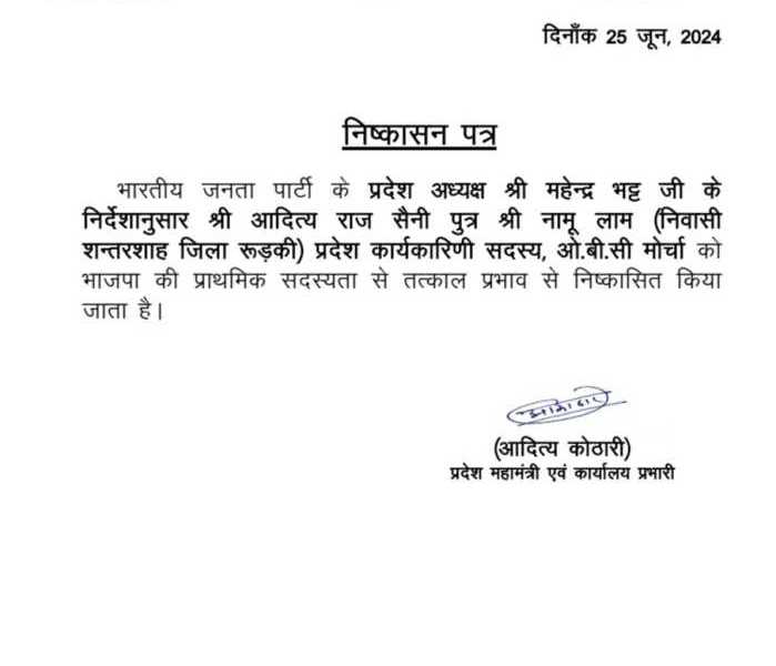 महिला संबंधी मामले में नाम आने के बाद भारतीय जनता पार्टी के प्रदेश अध्यक्ष श्री महेन्द्र भट्ट जी के निर्देशानुसार श्री आदित्य राज सैनी पुत्र श्री नामू लाम (निवासी शन्तरशाह जिला रुड़की) प्रदेश कार्यकारिणी सदस्य, ओ.बी.सी मोर्चा को भाजपा की प्राथमिक सदस्यता से तत्काल प्रभाव से निष्कासित किया जाता है।