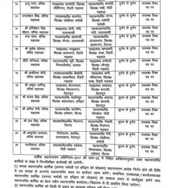 2116-22/स्था0 बैठक / 2024-25 दिनांक 02.05.2024, निदेशक, प्रारम्भिक शिक्षा, उत्तराखण्ड, देहरादून के पत्रांक / प्रा०शि०-दो (5)/784-2024/1344-46/2024-25 दिनांक 04 मई 2024 एवं वार्षिक स्थानान्तरण अधिनियम-2017 धारा-07, 08 एवं 09 में निहित व्यवस्था के कम में गढ़वाल मण्डलान्तर्गत विद्यालयों / कार्यालयों में कनिष्ठ सहायक पद (वेतनमान 21700-69100, लेवल-3) पर कार्यरत निम्नांकित कार्मिकों को तत्काल प्रभाव से सुगम क्षेत्र से दुर्गम क्षेत्र में अनिवार्य स्थानान्तरण के मानकानुसार स्तम्भ-4 में अंकित तैनाती स्थल पर स्थानान्तरित किया जाता है:-