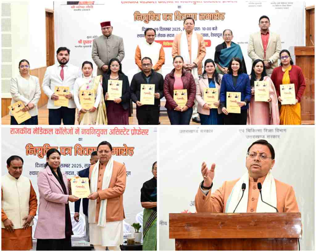 मुख्यमंत्री पुष्कर सिंह धामी ने मंगलवार को मुख्य सेवक सदन, मुख्यमंत्री आवास, देहरादून में आयोजित कार्यक्रम में प्रतिभाग करते हुए चिकित्सा सेवा चयन बोर्ड के माध्यम से चयनित राजकीय मेडिकल कॉलेजों में 142 असिस्टेंट प्रोफेसर्स को नियुक्ति पत्र वितरित किए।