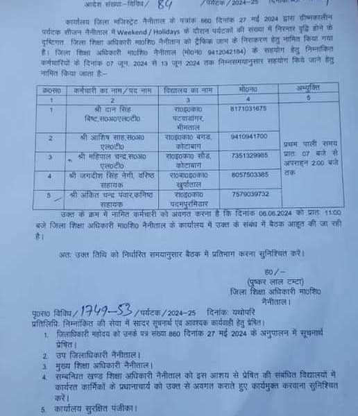 जिला मजिस्ट्रेट नैनीताल के पत्रांक 860 दिनांक 27 मई 2024 द्वारा ग्रीष्मकालीन पर्यटक सीजन नैनीताल में Weekend / Holidays के दौरान पर्यटकों की संख्या में निरन्तर वृद्धि होने के दृष्टिगत जिला शिक्षा अधिकारी मा०शि० नैनीतान को ट्रैफिक जाम के निराकरण हेतु नामित किया गया है। जिला शिक्षा अधिकारी मा०शि० नैनीताल (मो०न० 9412042184) के सहयोग हेतु निम्नांकित कर्मचारियों के दिनांक 07 जून, 2024 से 13 जून 2024 तक निम्नसमयानुसार सहयोग किये जाने हेतु नामित किया जाता है