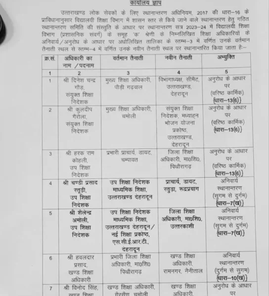 उत्तराखण्ड लोक सेवकों के लिए स्थानान्तरण अधिनियम, 2017 की धारा-16 के प्राविधानानुसार विद्यालयी शिक्षा विभाग में शासन स्तर से किये जाने वाले स्थानान्तरण हेतु गठित स्थानान्तरण समिति की संस्तुति के आधार पर स्थानान्तरण सत्र 2023-24 में