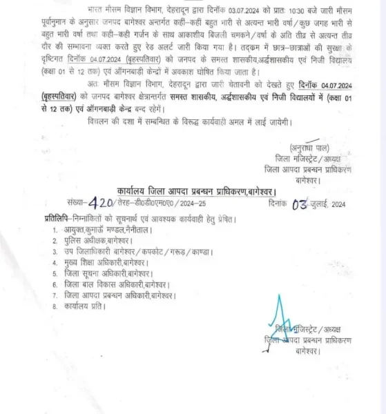 भारत मौसम विज्ञान विभाग, देहरादून द्वारा दिनाँक 03.07.2024 को प्रातः 10:30 बजे जारी मौसम पूर्वानुमान के अनुसार जनपद बागेश्वर अन्तर्गत कहीं-कहीं बहुत भारी से अत्यन्त भारी वर्षा/कुछ जगह भारी से बहुत भारी वर्षा तथा कही कही गर्जन के साथ आकाशीय बिजली चमकने/वर्षा के अति तीव्र से अत्यन्त तीव्र दौर की सम्भावना व्यक्त करते हुए रेड अलर्ट जारी किया गया है। तकम में छात्र-छात्राओं की सुरक्षा के दृष्टिगत दिनाँक 04.07.2024 (बृहस्पतिवार) को जनपद के समस्त शासकीय, अर्द्धशासकीय एवं निजी विद्यालय (कक्षा 01 से 12 तक) एवं ऑगनबाड़ी केन्द्रों में अवकाश घोषित किया जाता है।