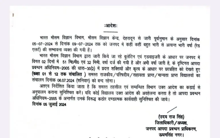 संचालन दिनांक 06.07.2024 (शनिवार) को बन्द रहेगा। अतएव निर्देशित किया जाता है कि समस्त तहसील एवं सम्बन्धित विभाग उक्त आदेश का कड़ाई से अनुपालन कराना सुनिश्चित करें। यदि कोई विद्यालय उक्त आदेश की अवहेलना करता है तो आपदा प्रबन्धन अधिनियम-2005 के अन्तर्गत उनके विरूद्ध कठोर दण्डात्मक कार्यवाही सुनिश्चित की जाये।