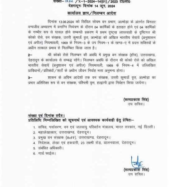 नॉर्थ चीफ कंजरवेटर ऑफिसर और जिला वन अधिकारी अल्मोड़ा को सस्पेंड कर दिया गया है_ आपको बता देंगे कि गुरुवार को अल्मोड़ा के बिनसर के जंगलों में भीषण आग लगी थी जिसकी सूचना मिलने के बाद वन विभाग की टीम मौके पर पहुंची और आग बुझाने के प्रयास में आठ कर्मचारियों वनाग्नि चपेट में आकर बुरी तरह झुलस गए थे__ इस घटना में जल से आठ कर्मचारियों में से चार ने मौके पर ही दम तोड़ दिया था जबकि चार गंभीर रूप से घायलों को सुशीला तिवारी अस्पताल में रेफर किया गया था जहां से चारों घायलों को दो एयर एंबुलेंस के जरिए दिल्ली के सफदरजंग अस्पताल में भर्ती कराया गया है मुख्यमंत्री पुष्कर सिंह धामी ने इस घटना को बेहद दुखद बताया है साथ ही उन्होंने घायलों के जल्द स्वस्थ होने की कामना भी की है__ मुख्यमंत्री ने कहा कि इस मामले में अभी जांच की जा रही है जो भी दोषी पाया जाएगा उसके खिलाफ भी सख्त कार्रवाई की जाएगी