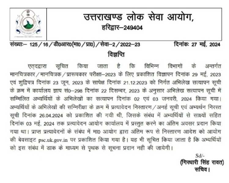 प्राप्त प्रत्यावेदनों के संबंध में मा० आयोग द्वारा अंतिम रूप से निस्तारण आदेश को आयोग की बेवसाइट psc.uk.gov.in पर प्रकाशित किया गया है। यह भी सूचित किया जाता है कि अभ्यर्थियों को इस संबंध में डाक के माध्यम से पृथक से सूचना प्रदान नही की जायेगी।