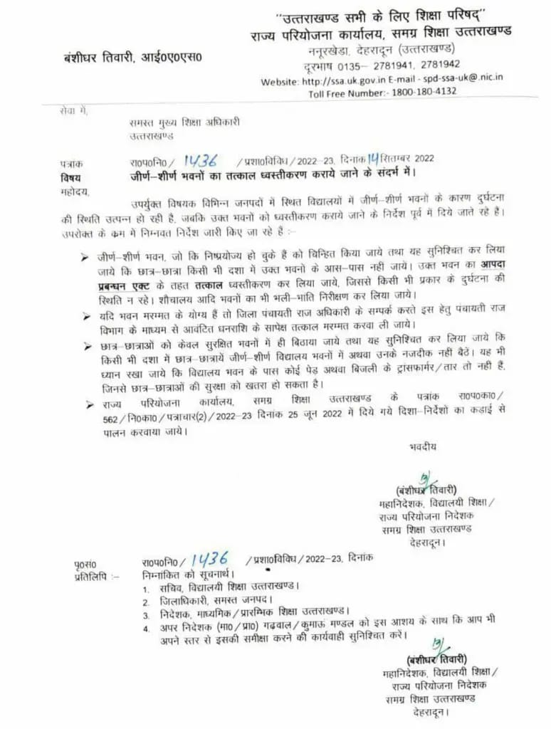 देहरादून- उत्तराखंड में स्कूलों की जर्जर हालत और चंपावत क्षेत्र में हुई घटना के बाद अब शिक्षा हरकत में आ गया है। महानिदेशक विद्यालयी शिक्षा एवं राज्य परियोजना निदेशक समग्र शिक्षा उत्तराखंड बंशीधर तिवारी ने उत्तराखंड के सभी मुख्य जिला शिक्षा अधिकारियों को पत्र भेजकर निर्देश दिए हैं कि वह अपने जनपदों के अंतर्गत समस्त विद्यालयों में स्थित जर्जर भवनों एवं शौचालयों के ध्वस्तीकरण की कार्रवाई तत्काल करें।