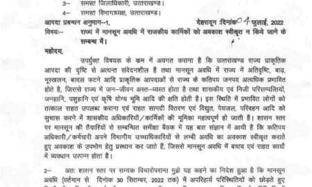 देहरादून :- राज्य में मानसून अवधि में राजकीय कार्मिकों को अवकाश स्वीकृत न किये जाने के उपर्युक्त विषयक के क्रम में...