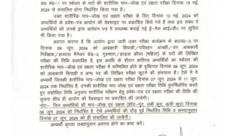 Share Tweet Share Email आयोग के परीक्षा कार्यक्रम, पत्रांक 118/परीक्षा/2024-25 दिनांक 26.04.2024 के क्र० सं०-1 पर स्केलर के पदों की शारीरिक माप-जोख...
