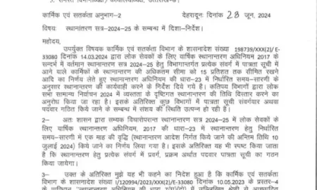 Share Tweet Share Email स्थानांतरण सत्र-2024-25 के सम्बन्ध में दिशा-निर्देश। 33080 उपर्युक्त विषयक कार्मिक एवं सतर्कता विभाग के शासनादेश संख्या 198739/XXX(2)/E- दिनांक...