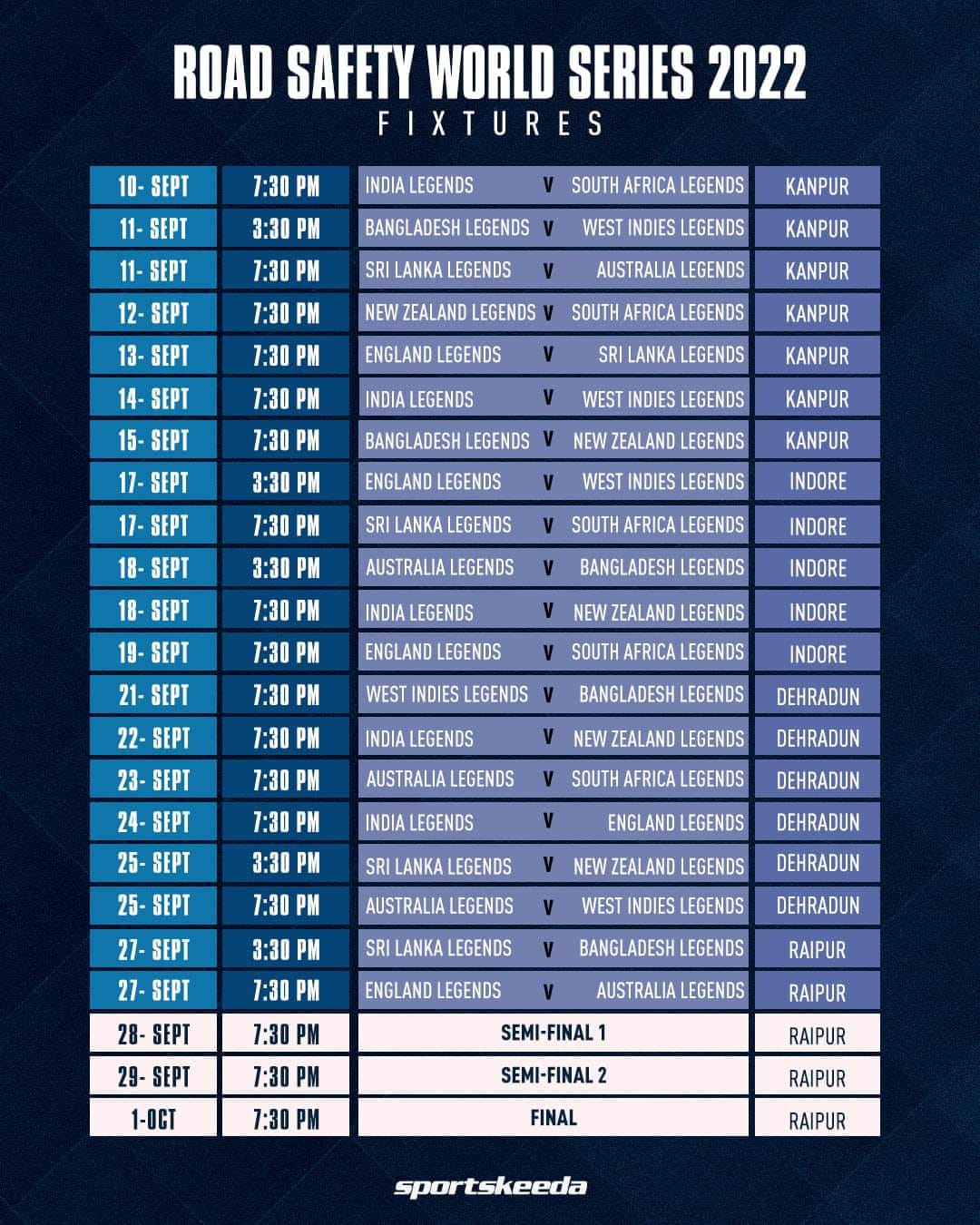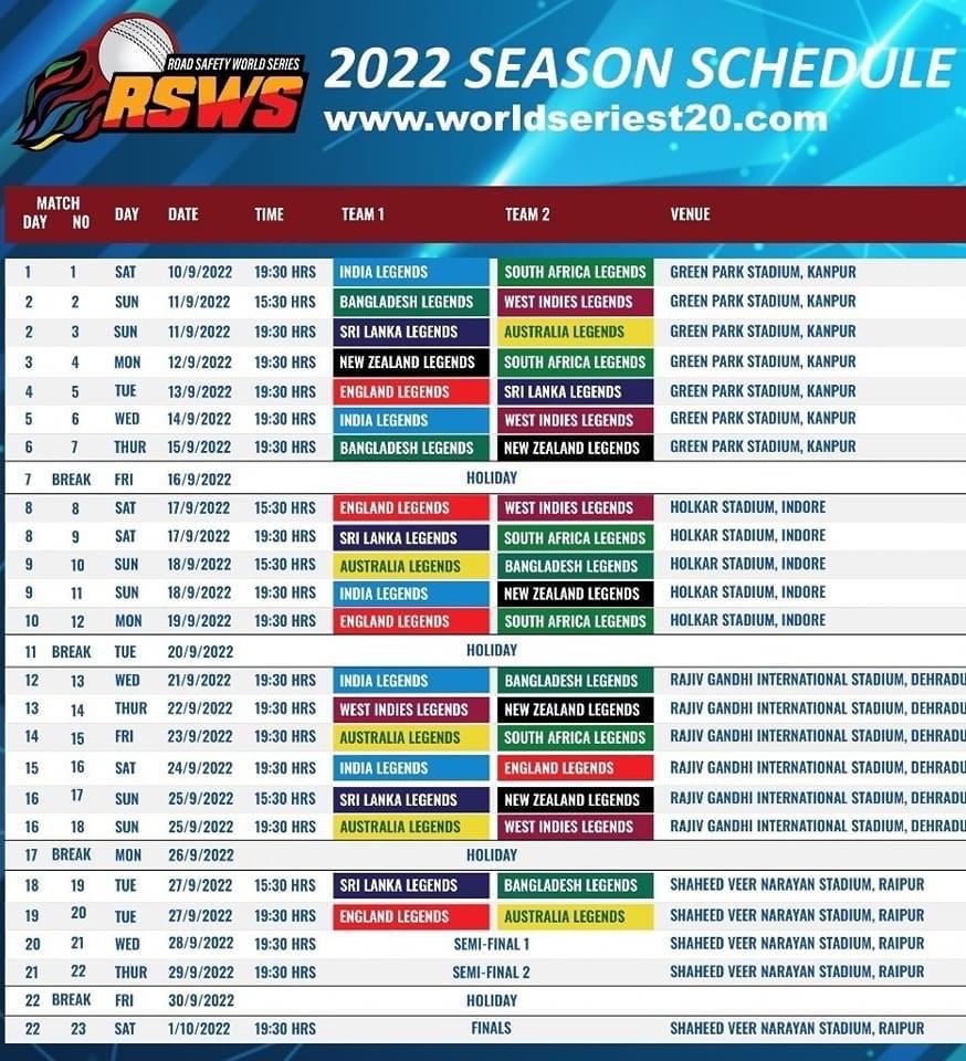 Road Safety World Series के मुकाबले IPL की तरह ही दो समय पर खेले जाएंगे. जिस दिन एक मैच खेला जाएगा, उस दिन मैच शाम 7:30 बजे से शुरू होगा और जिस दिन दो मैच होंगे उस दिन का पहला मुकाबला दोपहर 3:30 बजे से खेला जाएगा. इस मुकाबले का सीधा प्रसारण आप Colors Cineplex, Colors Cineplex Superhits और Sports18 Khel पर देख सकते हैं. इस मैच की लाइव स्ट्रीमिंग Jio TV और Voot पर उपलब्ध होगी. सभी मुकाबले कानपुर, देहरादून, रायपुर और इंदौर में खेले जाएंगे. 10 सितंबर को शाम 7:30 बजे से पहला मुकाबला खेला जाएगा जबकि इस टूर्नामेंट का फाइनल मुकाबला रायपुर में 1 अक्टूबर को खेला जाएगा.