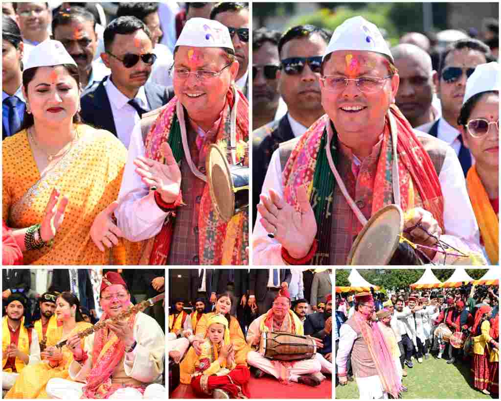 मुख्यमंत्री आवास का प्रांगण सोमवार को होली के रंगों में सराबोर नजर आया। इस दौरान प्रदेश की सांस्कृतिक समृद्धि और एकता के भी दर्शन हुए। पूर्वाह्न से ही प्रदेश भर के लोक कलाकारों, संस्कृति कर्मियों की टोलियां होली गायन करते हुए, सीएम आवास पहुंचती रही। एक तरफ गढ़वाल-कुमाऊं से लेकर जौनसार तक का होली गायन था, नृत्य था। इस दौरान होली के गीत गूंजे। पारंपरिक गायन हुआ। ढोल, मंजीरे बजे। पारंपरिक वाद्य यंत्रों की संगत ने होली गीतों के प्रभाव को और बढ़ा दिया। आओ दगड़ियो, नाचा गावा, आ गई रंगीली होली का आह्वान यदि कुमांउ से आए कलाकारों ने किया, तो राठ क्षेत्र के कलाकारों ने गाया-आई डान्ड्यू बसंत, डाली मा मौल्यार।