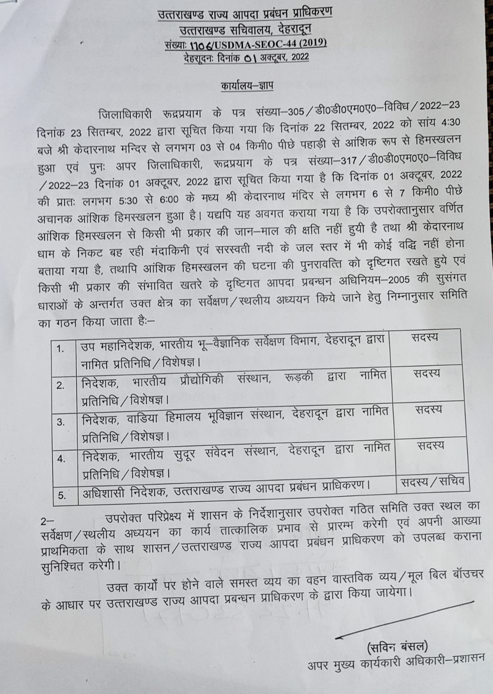 जिलाधिकारी रुद्रप्रयाग के पत्र संख्या – 305 / डी०डी०एम०ए०-विविध / 2022-23 दिनांक 23 सितम्बर, 2022 द्वारा सूचित किया गया कि दिनांक 22 सितम्बर, 2022 को सांय 4:30 बजे केदारनाथ मन्दिर से लगभग 03 से 04 किमी० पीछे पहाड़ी से आंशिक रूप से हिमस्खलन हुआ एवं पुनः अपर जिलाधिकारी, रूद्रप्रयाग के पत्र संख्या-317 / डी०डी०एम०ए० – विविध /2022-23 दिनांक 01 अक्टूबर, 2022 द्वारा सूचित किया गया है कि दिनांक 01 अक्टूबर, 2022 की प्रातः लगभग 5:30 से 6:00 के मध्य श्री केदारनाथ मंदिर से लगभग 6 से 7 किमी0 पीछे अचानक आंशिक हिमस्खलन हुआ है। यद्यपि यह अवगत कराया गया है कि उपरोक्तानुसार वर्णित आंशिक हिमस्खलन से किसी भी प्रकार की जान-माल की क्षति नहीं हुयी है तथा श्री केदारनाथ धाम के निकट बह रही मंदाकिनी एवं सरस्वती नदी के जल स्तर में भी कोई वृद्धि नहीं होना बताया गया है, तथापि आंशिक हिमस्खलन की घटना की पुनरावत्ति को दृष्टिगत रखते हुये एवं किसी भी प्रकार की संभावित खतरे के दृष्टिगत आपदा प्रबन्धन अधिनियम-2005 की सुसंगत धाराओं के अन्तर्गत उक्त क्षेत्र का सर्वेक्षण / स्थलीय अध्ययन किये जाने हेतु निम्नानुसार समिति का गठन किया जाता है: