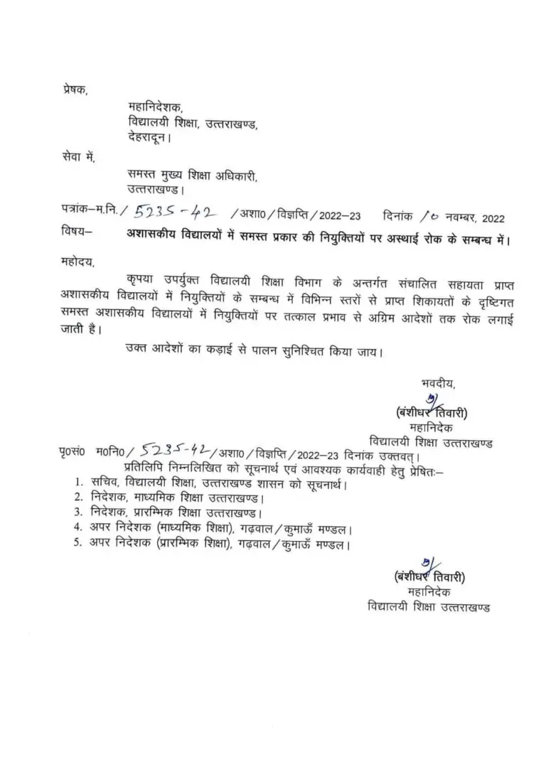 शिक्षा महानिदेशक बंशीधर तिवारी ने आदेश जारी करते हुए कहा है की विद्यालय शिक्षा विभाग के अंतर्गत संचालित सहायता प्राप्त अशासकीय विद्यालयों में नियुक्तियों के संबंध में विभिन्न स्तरों से प्राप्त शिकायतों के दृष्टिगत समस्त अशासकीय विद्यालयों में नियुक्तियों पर तत्काल प्रभाव से अग्रिम आदेशों तक रोक लगाई जाती है और समस्त मुख्य शिक्षा अधिकारी इस आदेशों का कड़ाई से पालन करना सुनिश्चित करेंगे