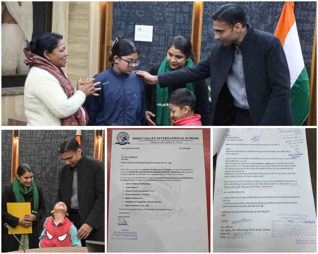 मा0 मुख्यमंत्री के निर्देश पर जिला प्रशासन ने विधवा शांति राणा की 8वीं में पढ रही बेटी अंशिका की कक्षा 12 तक 1.62 लाख फीस कराई स्कूल प्रबन्धन के खाते में एकमुश्त जमा करा दी है। जिलाधिकारी सविन बंसल की अध्यक्षता में विगत नवम्बर माह में आयोजित जनता दर्शन कार्यक्रम के दौरान शांति राणा ने अपनी पीड़ा साझा की थी। उन्होंने बताया कि उनके पति मनबहादुर ने परिवार की आजीविका के लिए ई-रिक्शा क्रय करने हेतु 3,72,600 रुपये का बैंक ऋण लिया था। दुर्भाग्यवश एक सड़क दुर्घटना में उनके पति की मृत्यु हो गई, जिसके बाद परिवार में कोई कमाने वाला शेष नहीं रहा। वर्तमान में शांति राणा की 12 वर्षीय पुत्री अंशिका, 5 वर्षीय पुत्र अक्षय एवं एक अन्य किशोर पुत्र है, जिनके भरण-पोषण और सीमित संसाधनों के चलते वह ऋण की किश्तें जमा करने में असमर्थ थीं।