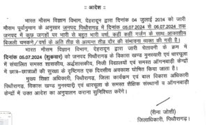 Share Tweet Share Email निदेशक, मौसम विज्ञान विभाग, देहरादून के द्वारा दिनांक 04.07.2024 को अपराहन 2:00 बजे जारी मौसम पूर्वानुमान के...