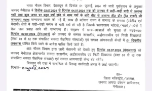 Share Tweet Share Email भारी बारिश के रेड अलर्ट के चलते कल स्कूलों में छुट्टी के निर्देश दिनांक 01 जुलाई, 2024 को...