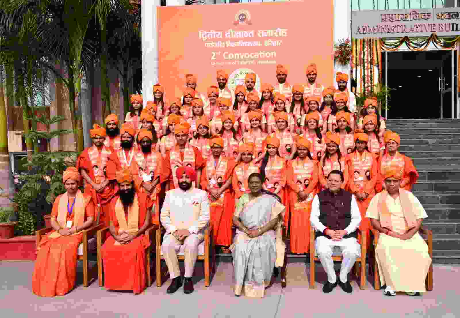राष्ट्रपति द्रौपदी मुर्मु ने पतंजलि विश्वविद्यालय हरिद्वार के द्वितीय दीक्षांत समारोह में स्वर्ण पदक प्राप्त विद्यार्थियों को सम्मानित किया। रविवार को आयोजित इस कार्यक्रम में कुल 1454 विद्यार्थियों को उपाधि प्रदान की गई। 62 शोधार्थियों को विद्या वारिधि और 3 शोधार्थियों को विद्या वाचस्पति की उपाधि प्रदान की गई, जबकि 615 विद्यार्थियों को परास्नातक और 774 विद्यार्थियों को स्नातक की उपाधि प्रदान की गई। इस अवसर पर राज्यपाल लेफ्टिनेंट जनरल गुरमीत सिंह (से नि.) ने राष्ट्रपति को राष्ट्रपति भवन की विविध वनस्पतियों पर आधारित दो पुस्तकें ‘फ्लोरा ऑफ राष्ट्रपति भवन’ एवं ‘मेडिसिनल प्लांट्स ऑफ राष्ट्रपति भवन’ की प्रतिलिपियाँ भी भेंट कीं।