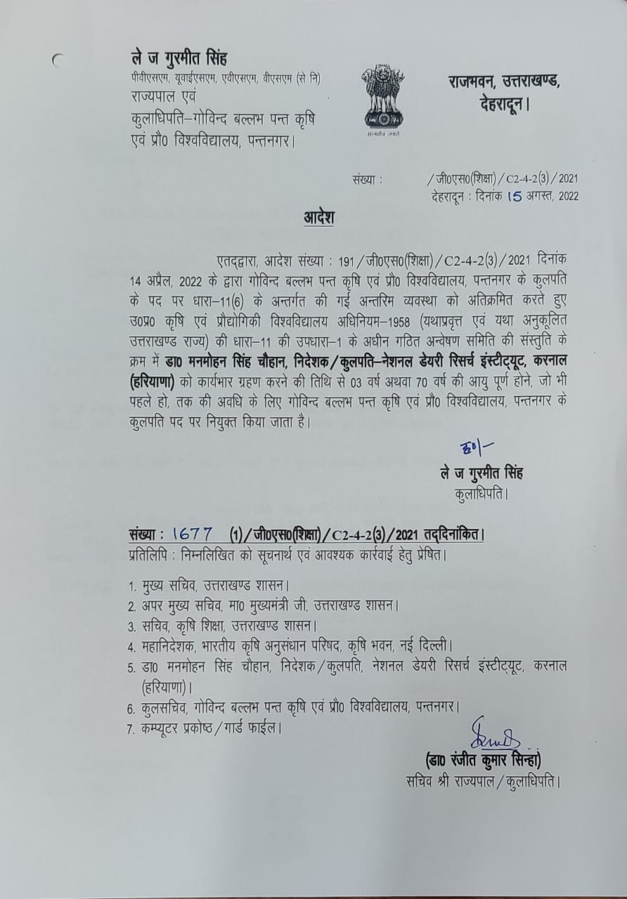 एतद्द्वारा आदेश संख्या 191/जी०एस० (शिक्षा)/C2-4-2(3)/2021 दिनांक 14 अप्रैल, 2022 के द्वारा गोविन्द बल्लभ पन्त कृषि एवं प्रौ० विश्वविद्यालय, पन्तनगर के कुलपति के पद पर धारा-11(6) के अन्तर्गत की गई अन्तरिम व्यवस्था को अतिक्रमित करते हुए उ०प्र० कृषि एवं प्रौद्योगिकी विश्वविद्यालय अधिनियम-1958 ( यथाप्रवृत्त एवं यथा अनुकूलित उत्तराखण्ड राज्य) की धारा-11 की उपधारा-1 के अधीन गठित अन्वेषण समिति की संस्तुति के क्रम में डा० मनमोहन सिंह चौहान, निदेशक / कुलपति-नेशनल डेयरी रिसर्च इंस्टीट्यूट, करनाल (हरियाणा) को कार्यभार ग्रहण करने की तिथि से 03 वर्ष अथवा 70 वर्ष की आयु पूर्ण होने, जो भी पहले हो तक की अवधि के लिए गोविन्द बल्लभ पन्त कृषि एवं प्री० विश्वविद्यालय, पन्तनगर के कुलपति पद पर नियुक्त किया जाता है।