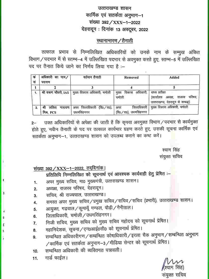उत्तराखंड शासन से आज की बड़ी खबर, आईएएस वरुण चौधरी को सीडीओ चमोली के पद से हटाया गया,